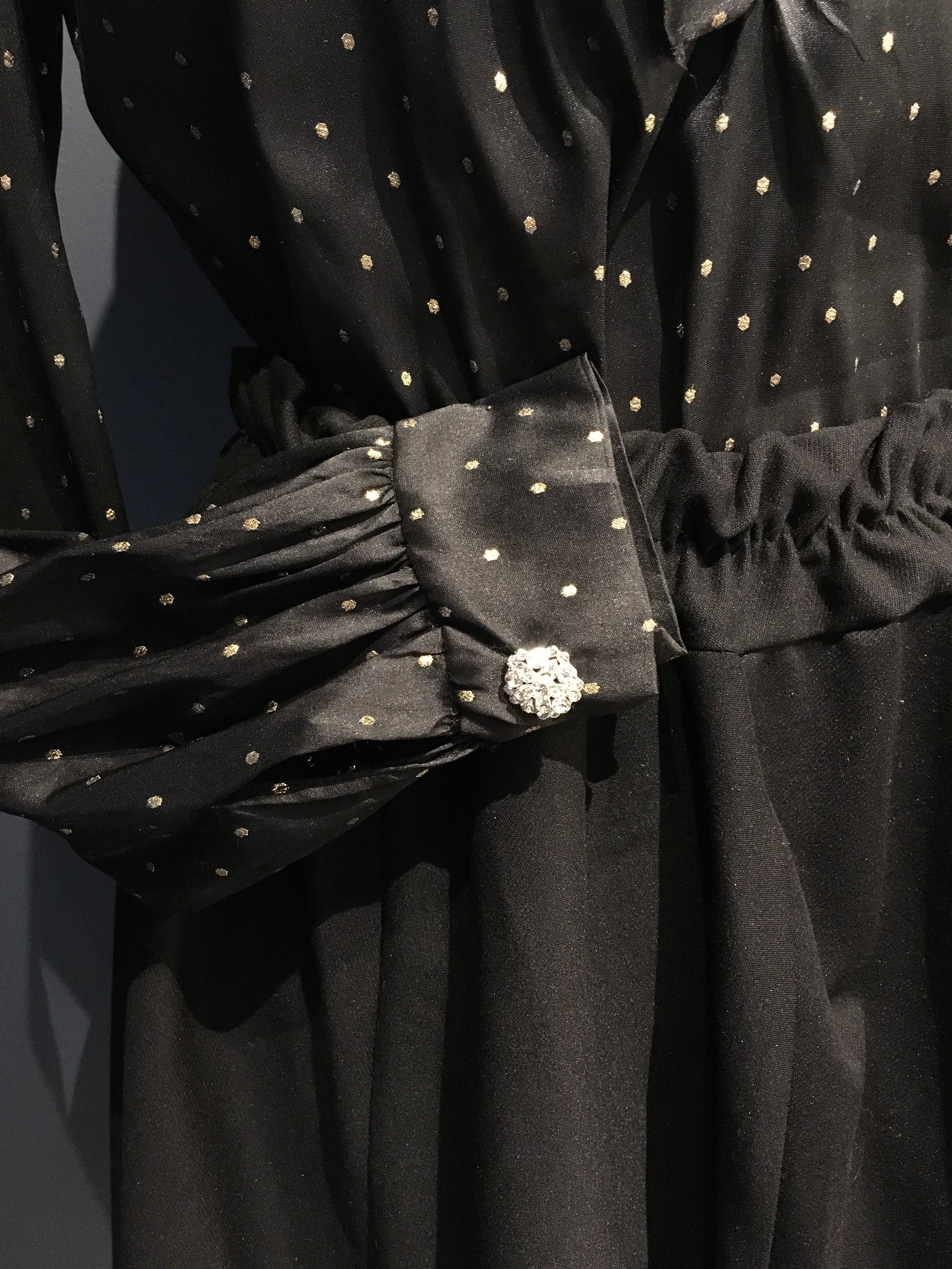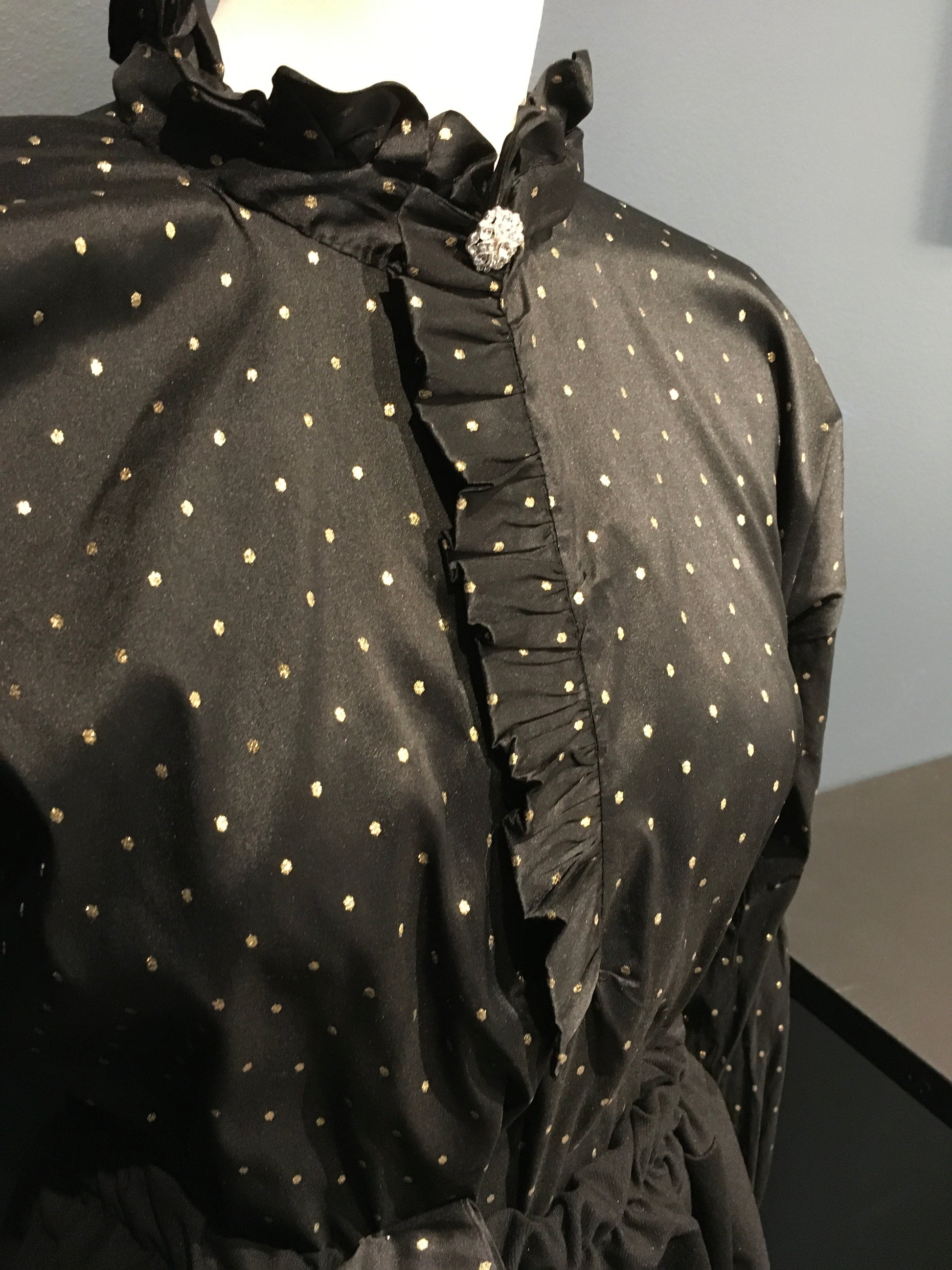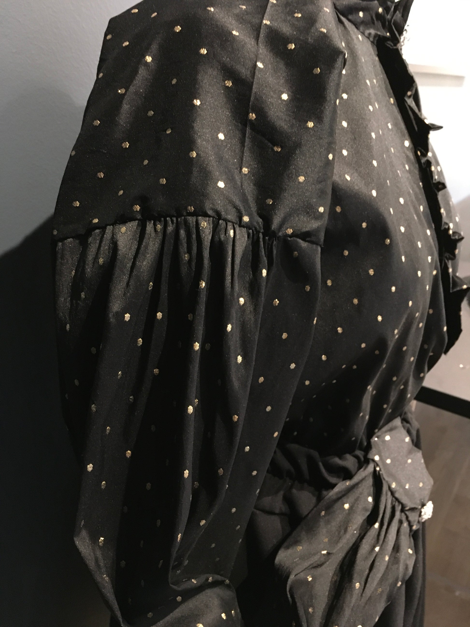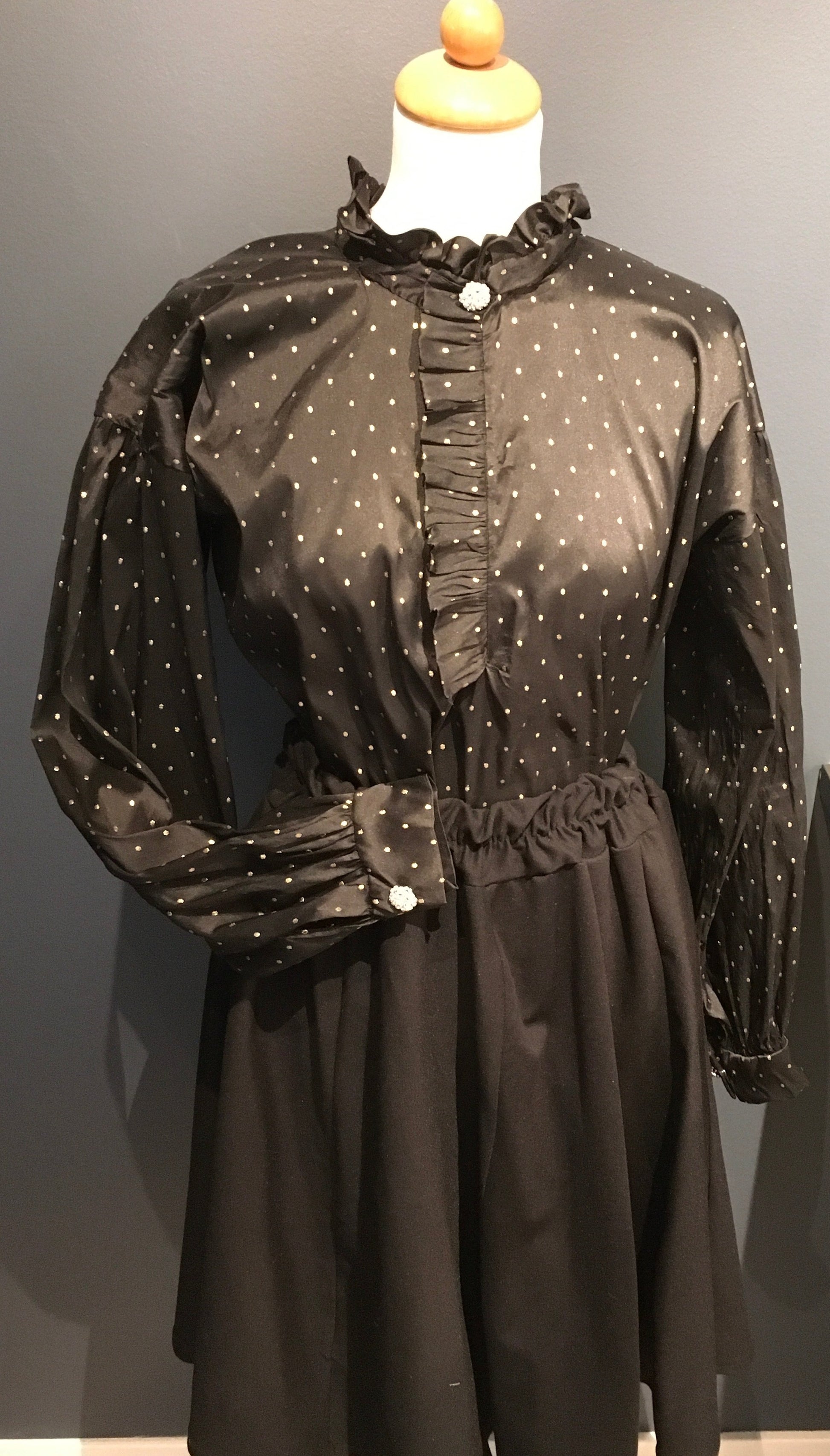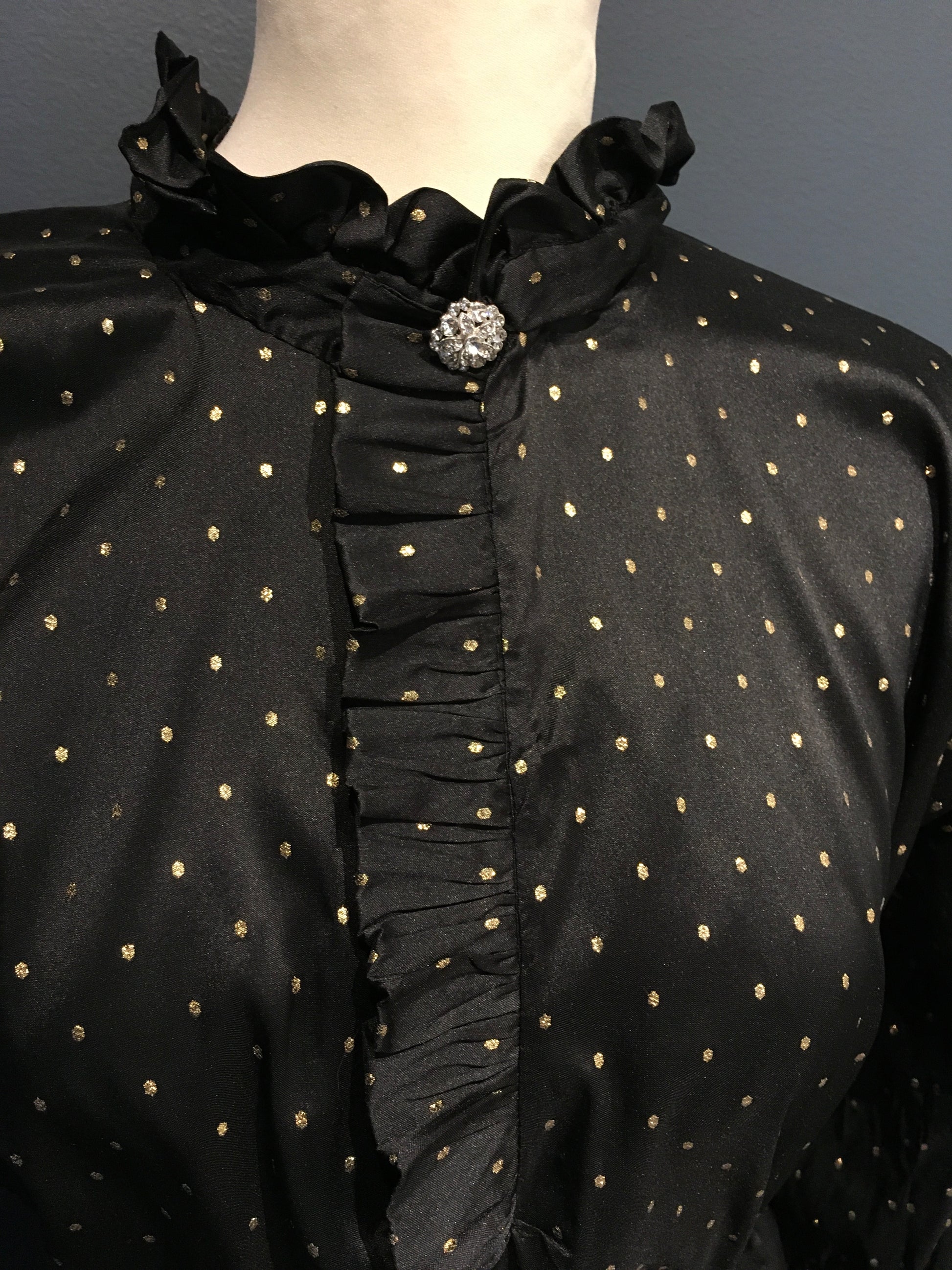 Lekker bluse til mange anledninger. Stoffet er sort med gullprikker. Har sydd