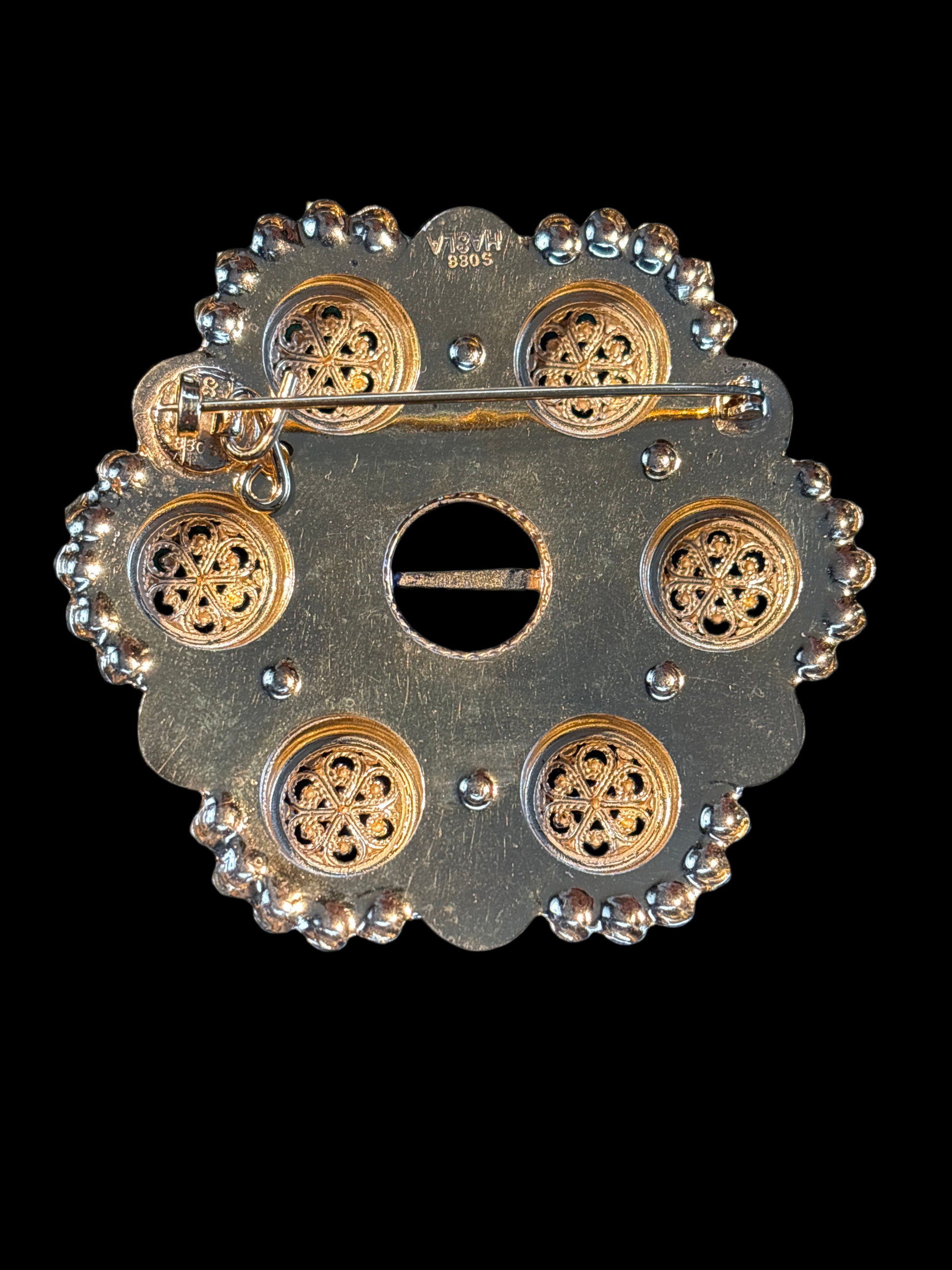 Oppdag skjønnheten og tradisjonen i denne nydelige bolesøljen fra Telemark, en tidløs klassiker innen norsk folkedrakt. Med en diameter på 7 cm, i antikkgylt, og her med en rosa sten. Dette er et smykket som er symbol på håndverkskvalitet og tradisjonell design.