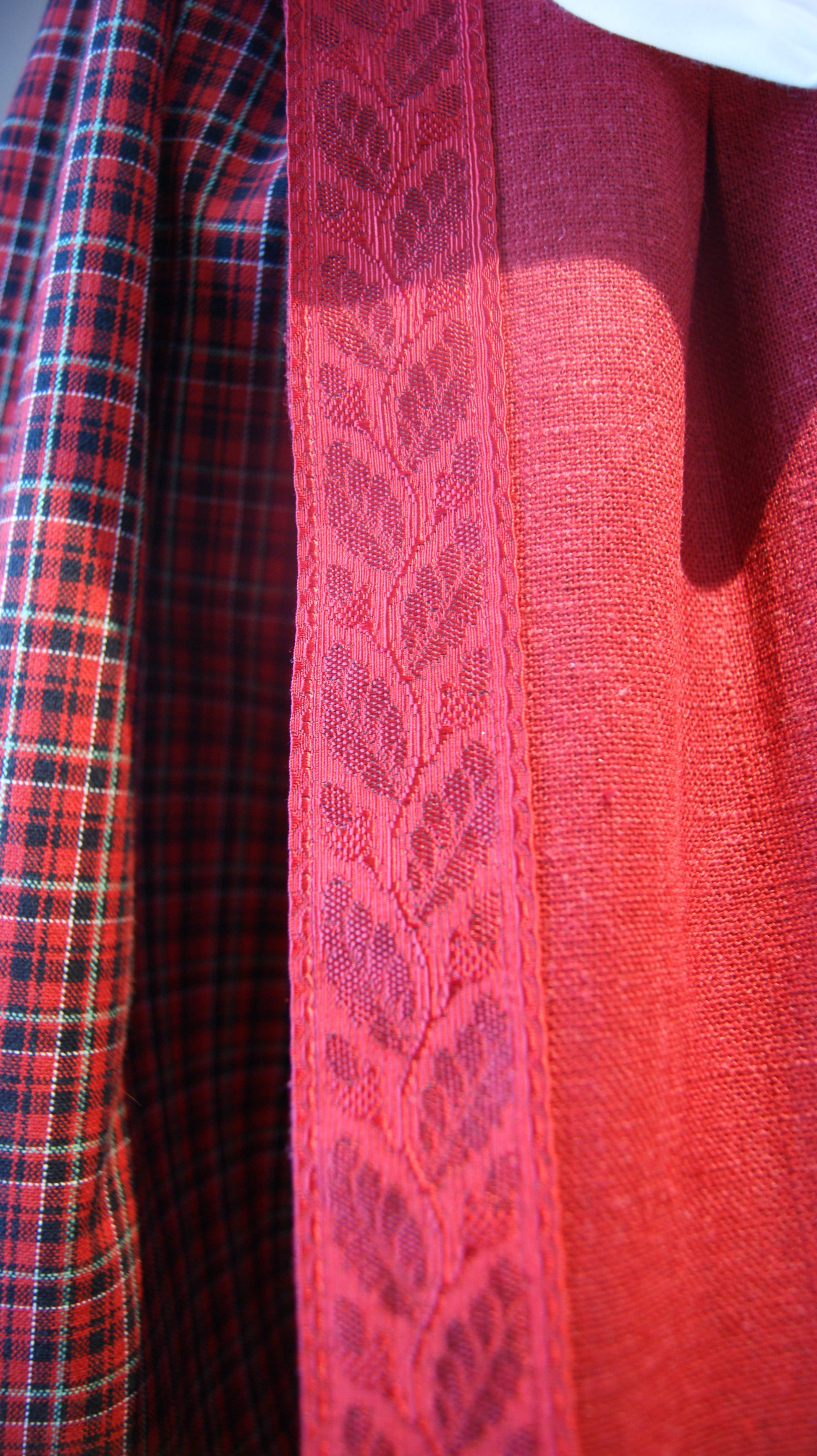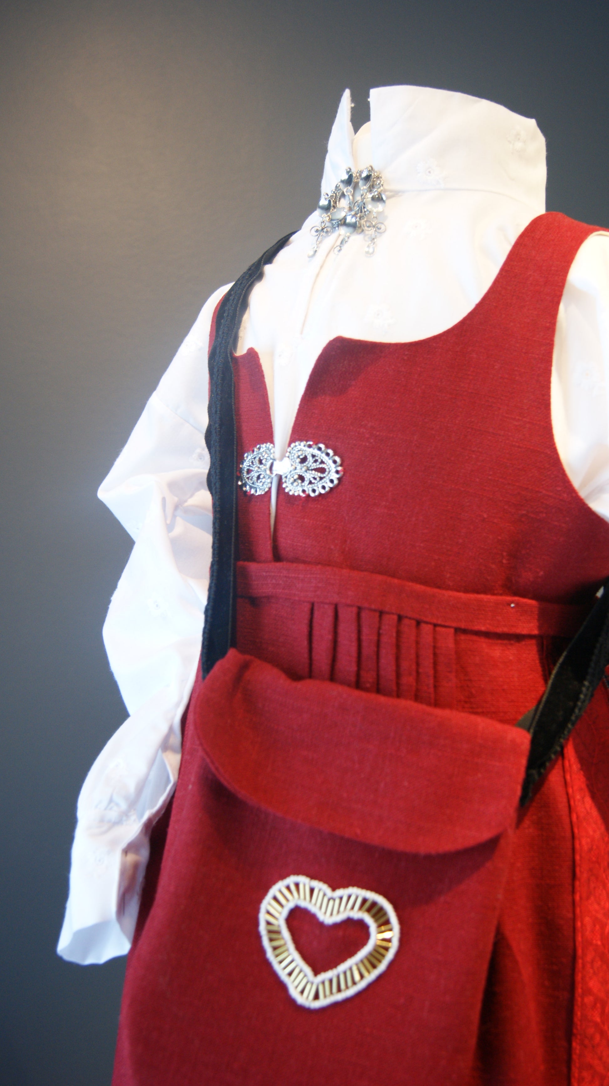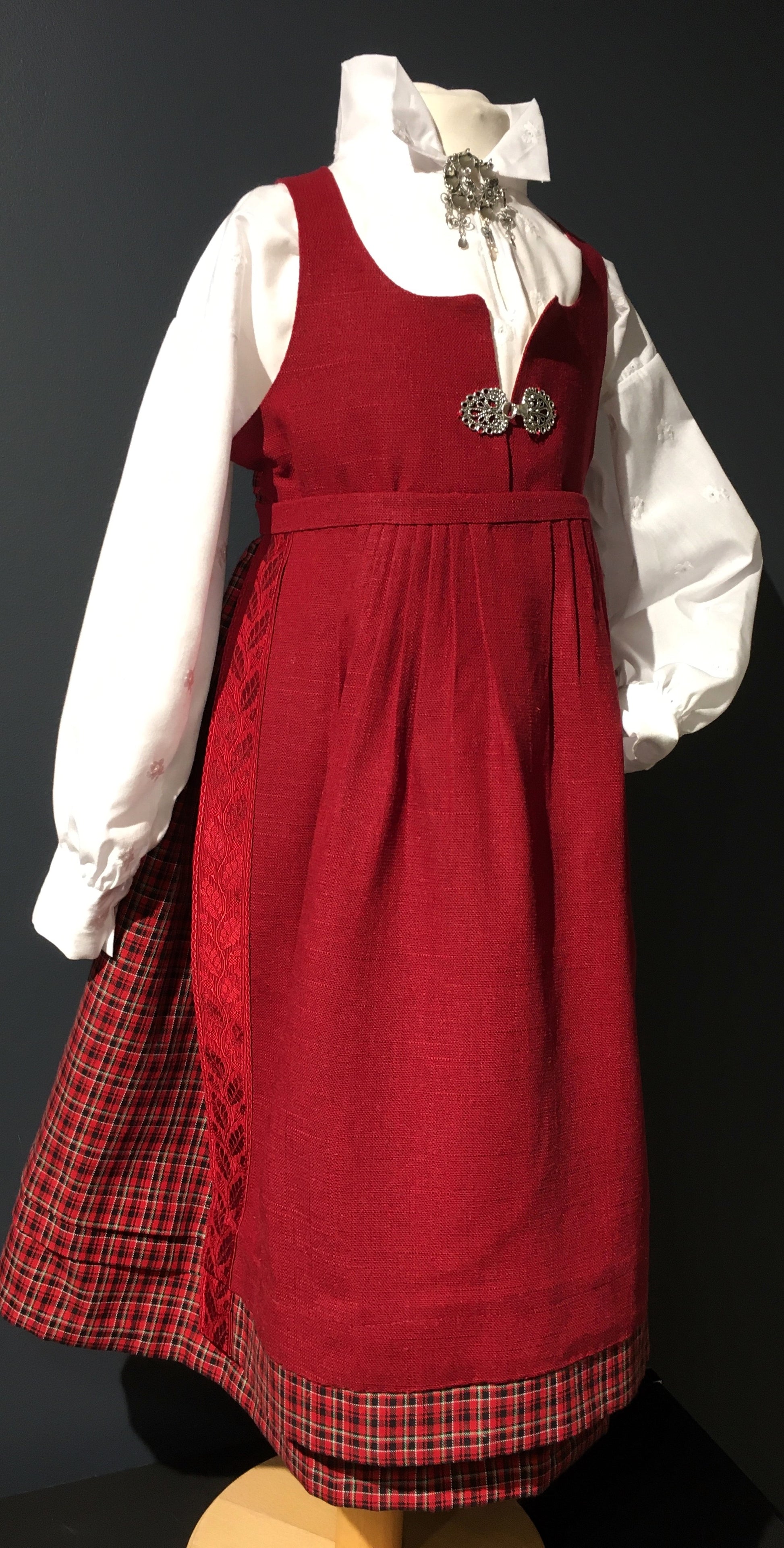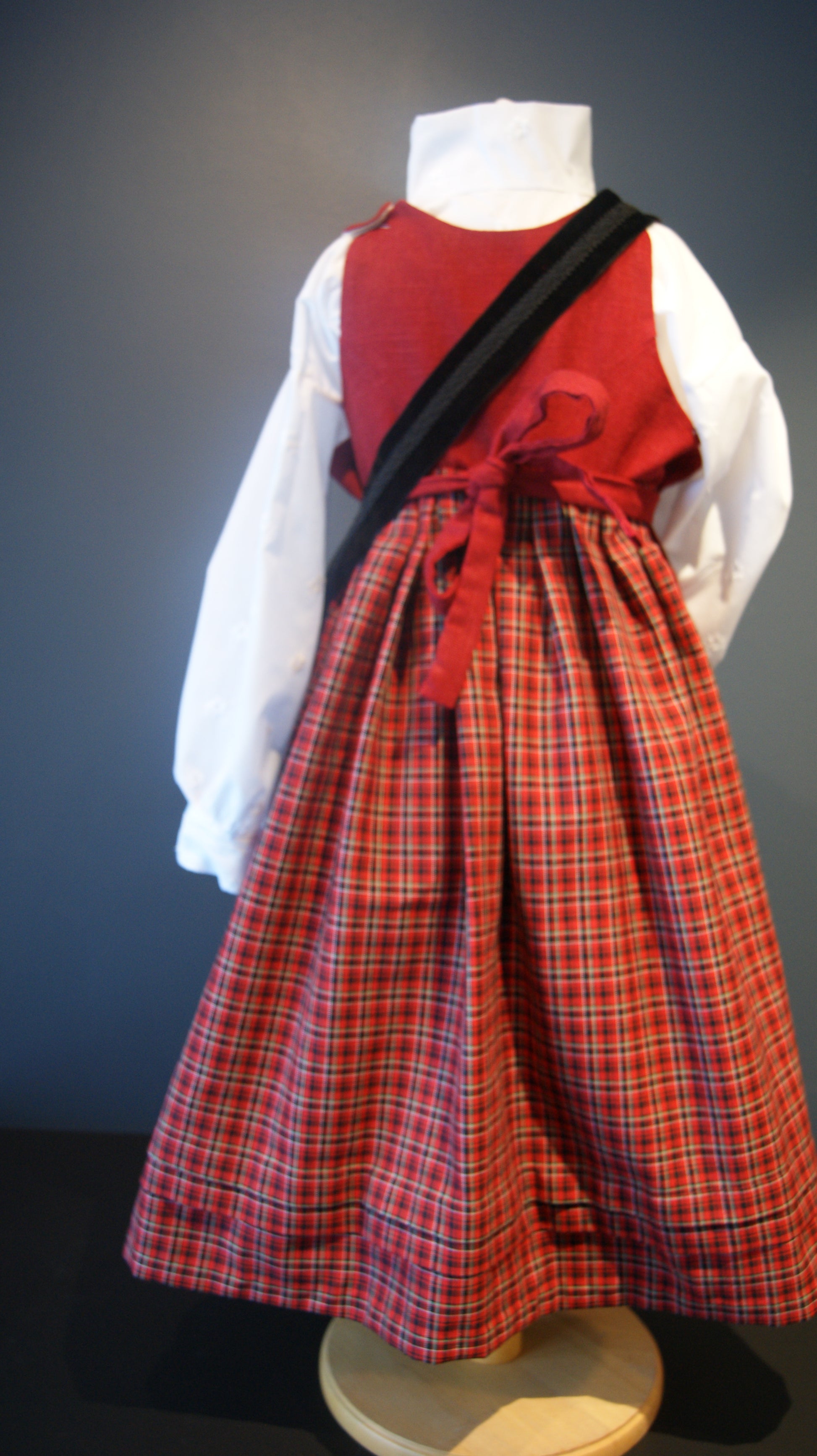 Festbunad til jente på ca 5-6 år. Den rutete stakken er kvalitet bomulls stoff fra en kjent leverandør av bunads stoffer. Det er lagt folder på stakken, så er her det mulighet å legge ned. Livet og forkle er i mørkerød lin som passer veldig fint til den smårutete stakken. Både livet og forkle er det også muligheter justere inn eller ut. Skjorten er i bomull og med små blomster i stoffet.