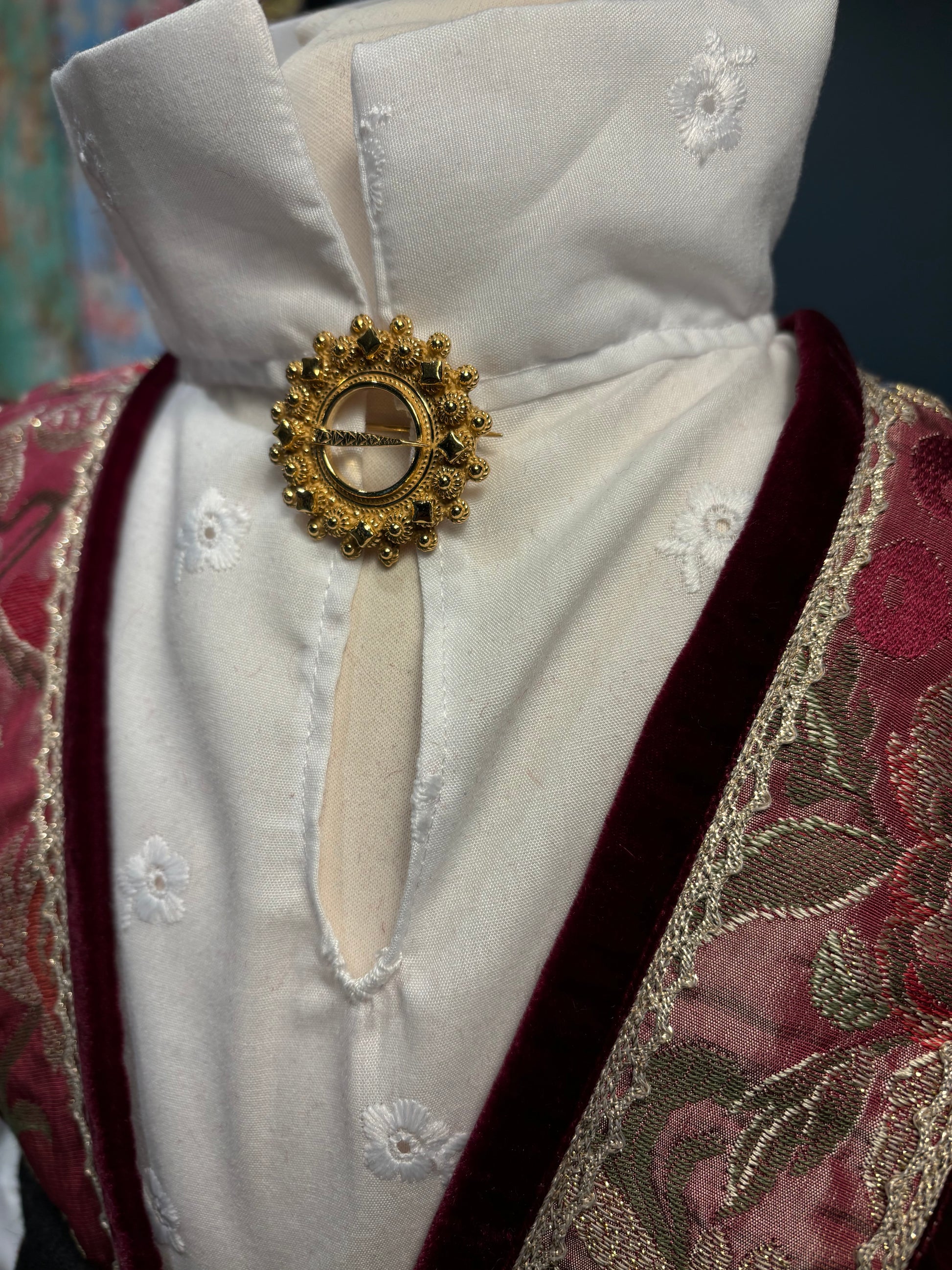 Denne elegante halsringen er et perfekt tilbehør til beltestakken. Med sin 3 cm bredde og utført i gammel forgylt stil, er halsringen og tidløst smykke som fremhever den tradisjonelle draktens vakre detaljer. Designet i Setesdal med stor omsorg, gir denne halsringen og eksklusivt uttrykk som kombinerer historisk preg med moderne kvalitet.