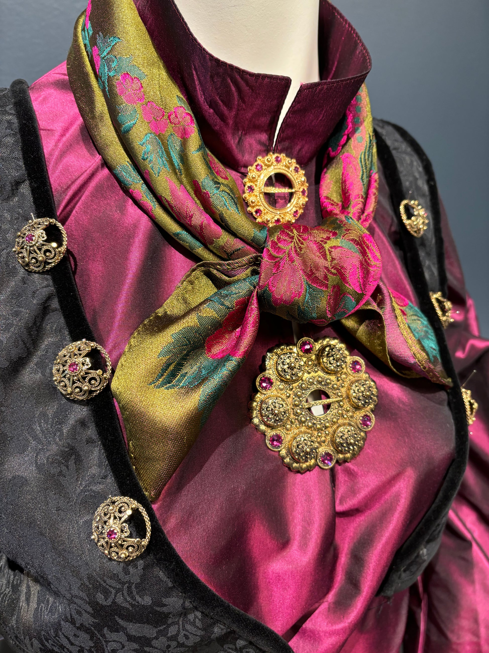 Denne elegante halsringen er et perfekt tilbehør til beltestakken. Med sin 3,5cm bredde og utført i antikkgylt sølv er halsringen og tidløst smykke som fremhever den tradisjonelle draktens vakre detaljer. Designet i Setesdal med stor omsorg, gir denne halsringen og eksklusivt uttrykk som kombinerer historisk preg med moderne kvalitet.