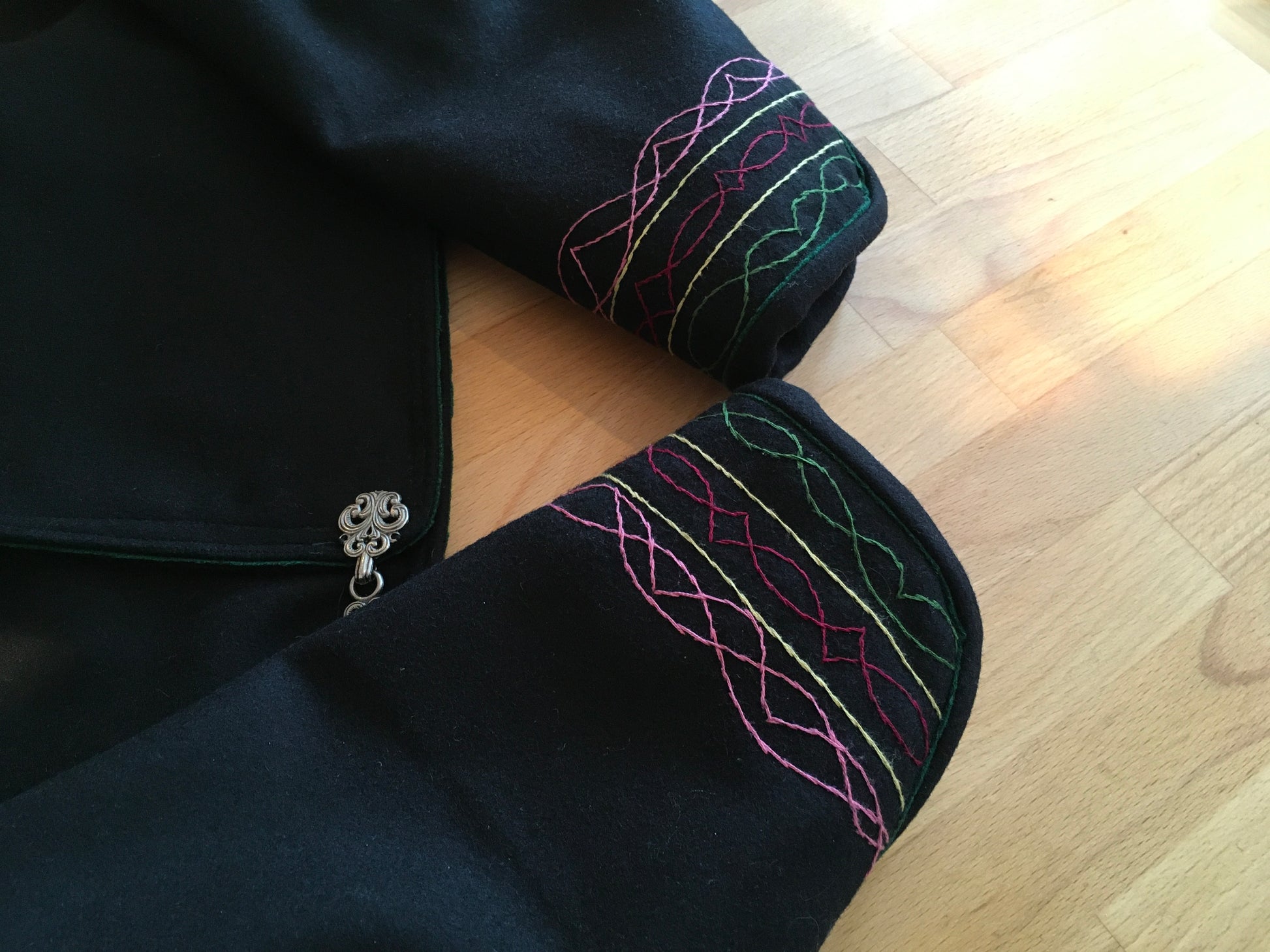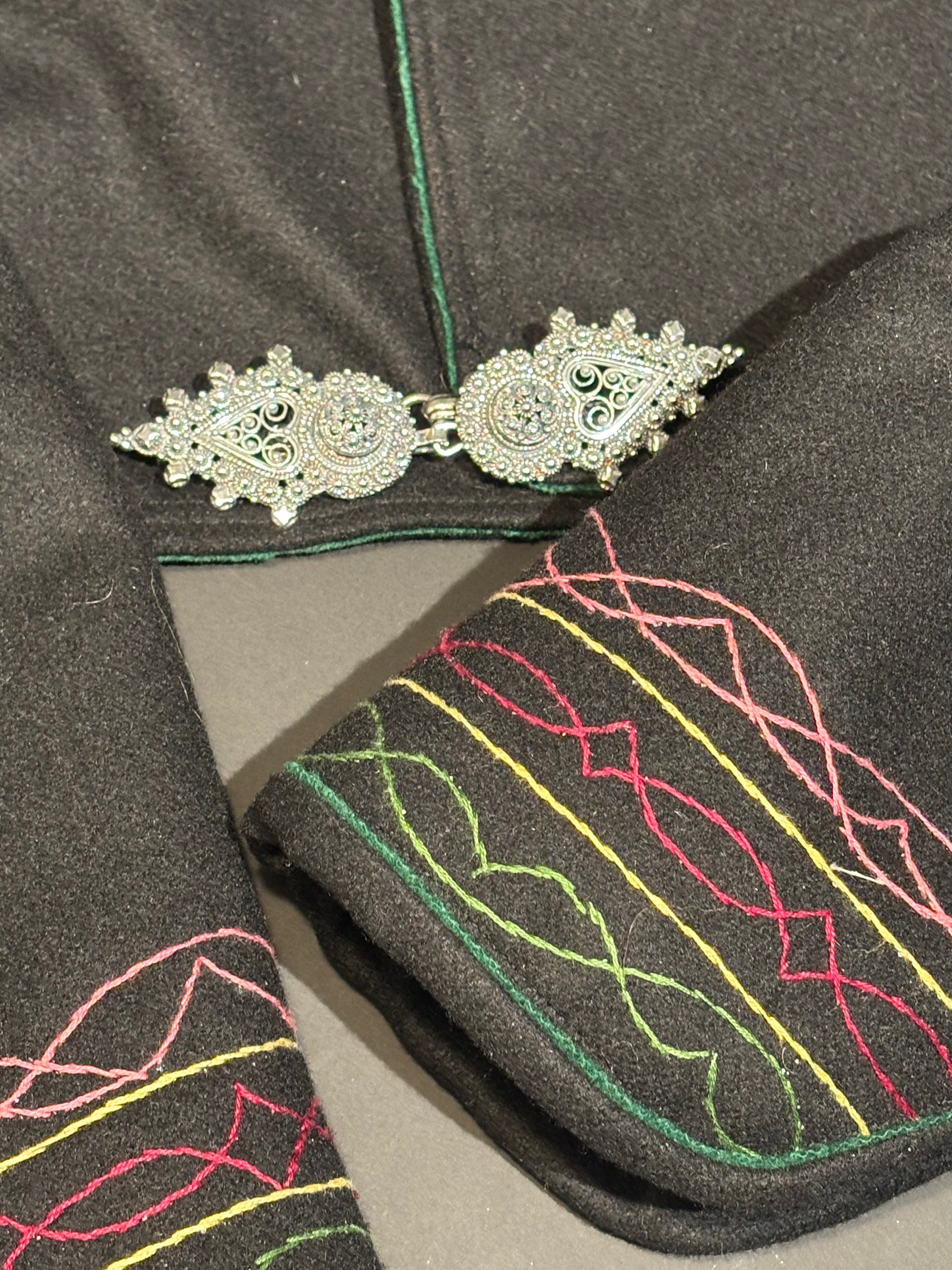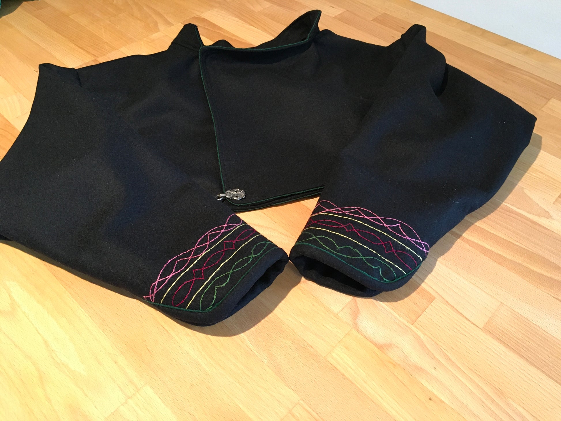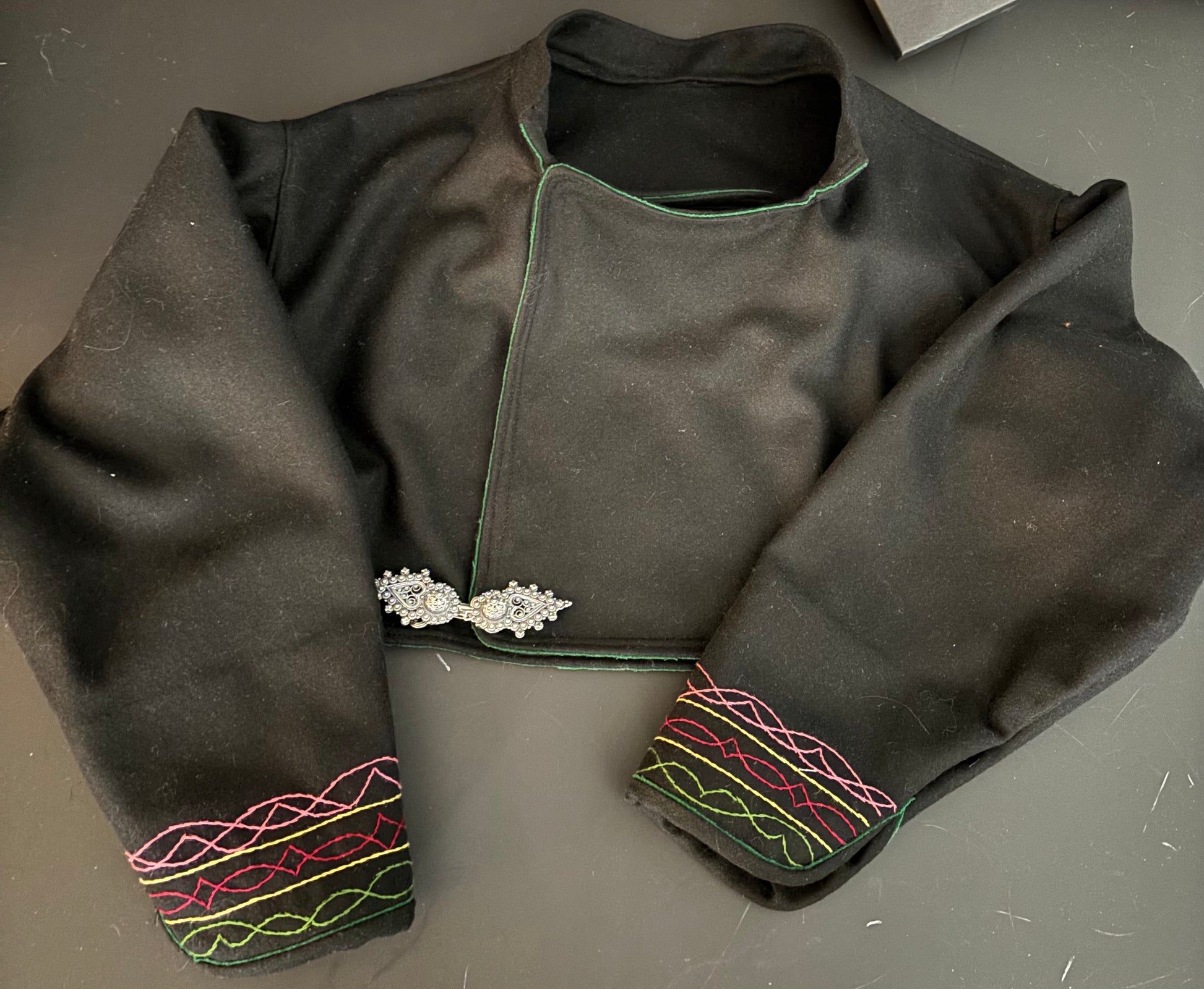 Fullfør din beltestakk med mine nydelige utenpåtrøye! Med elegante grønne tittekanter og et forfriskende rødt for, legger denne trøyen til en sprudlende touch til din tradisjonelle beltestakk. Den praktiske hekten holder jakken på plass, mens broderiet nederst på ermene gir det lille ekstra. Brystvidde 100 cm - 104 cm