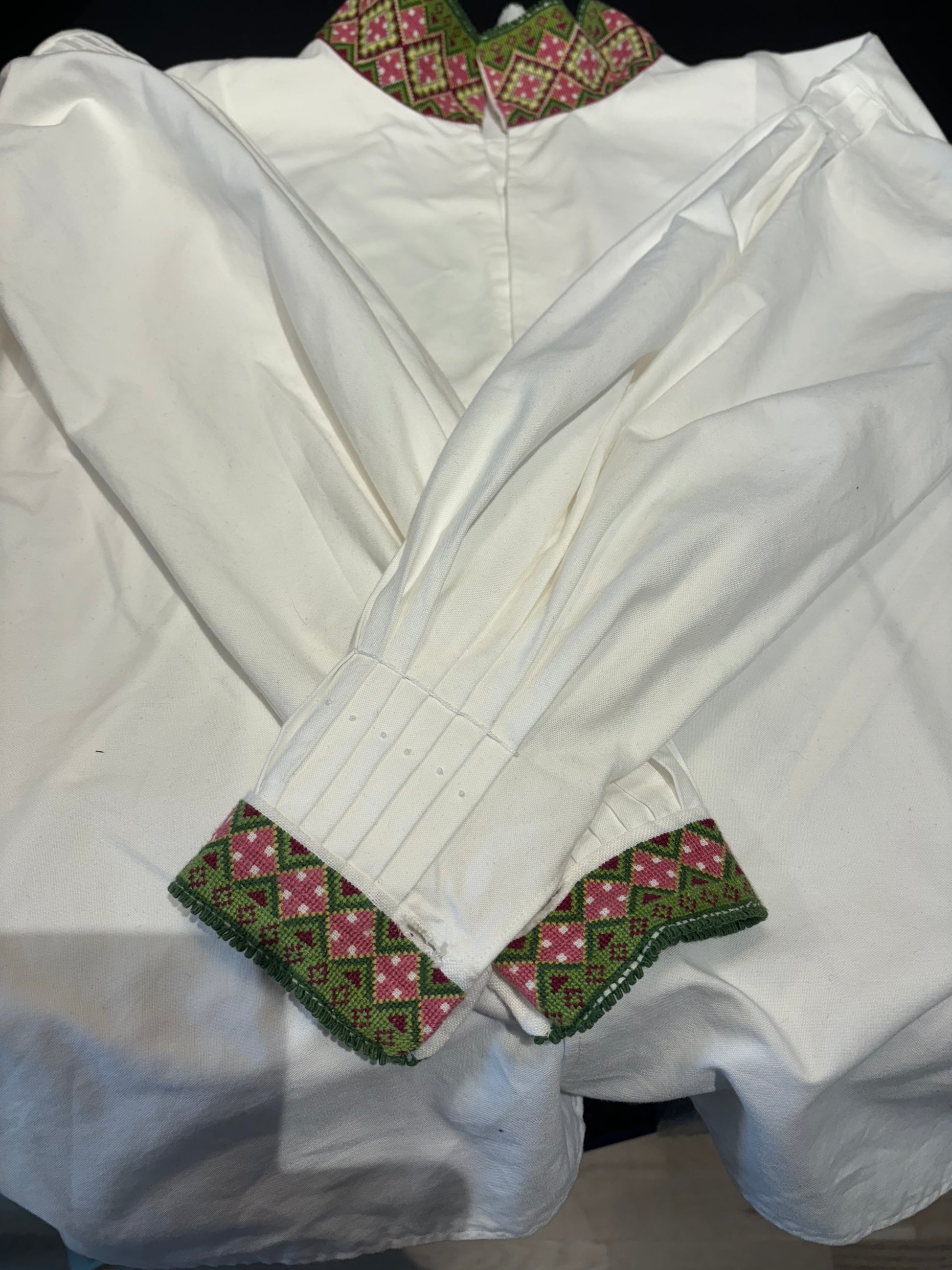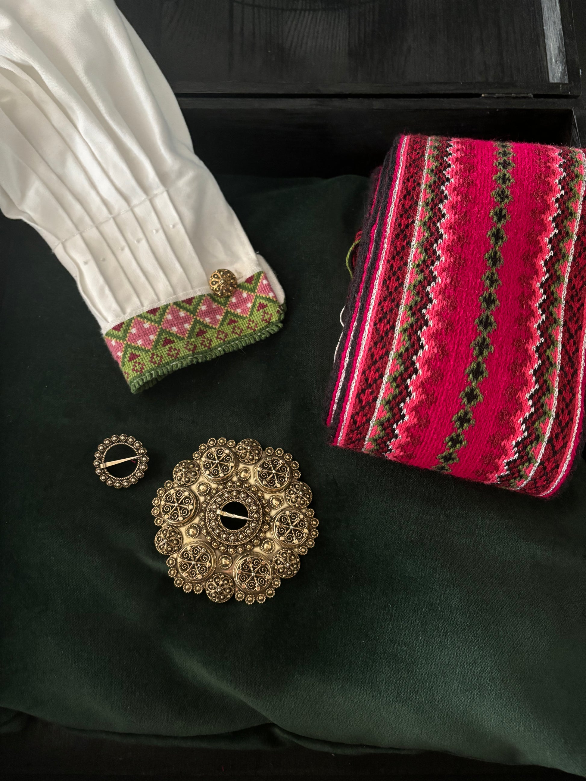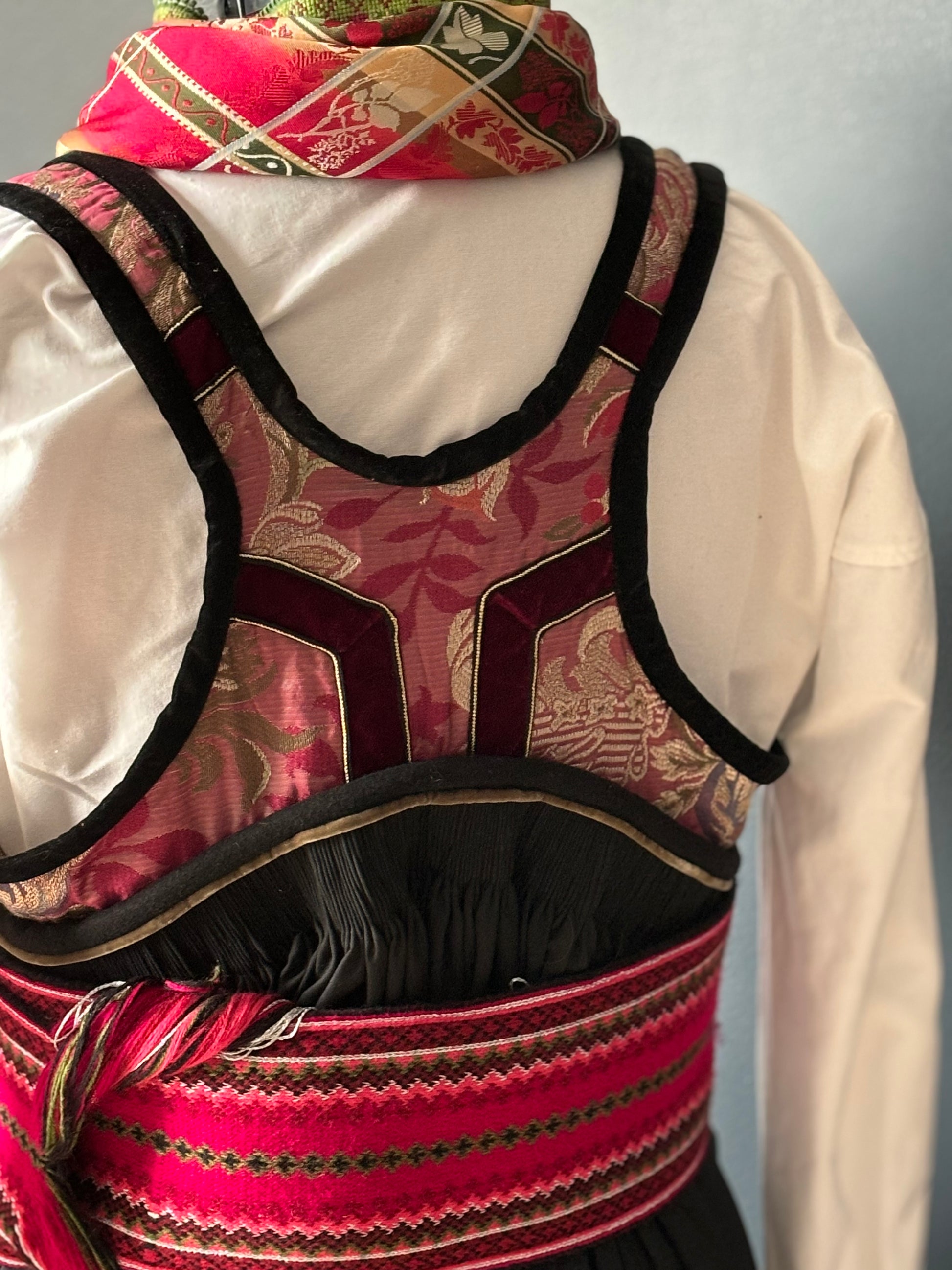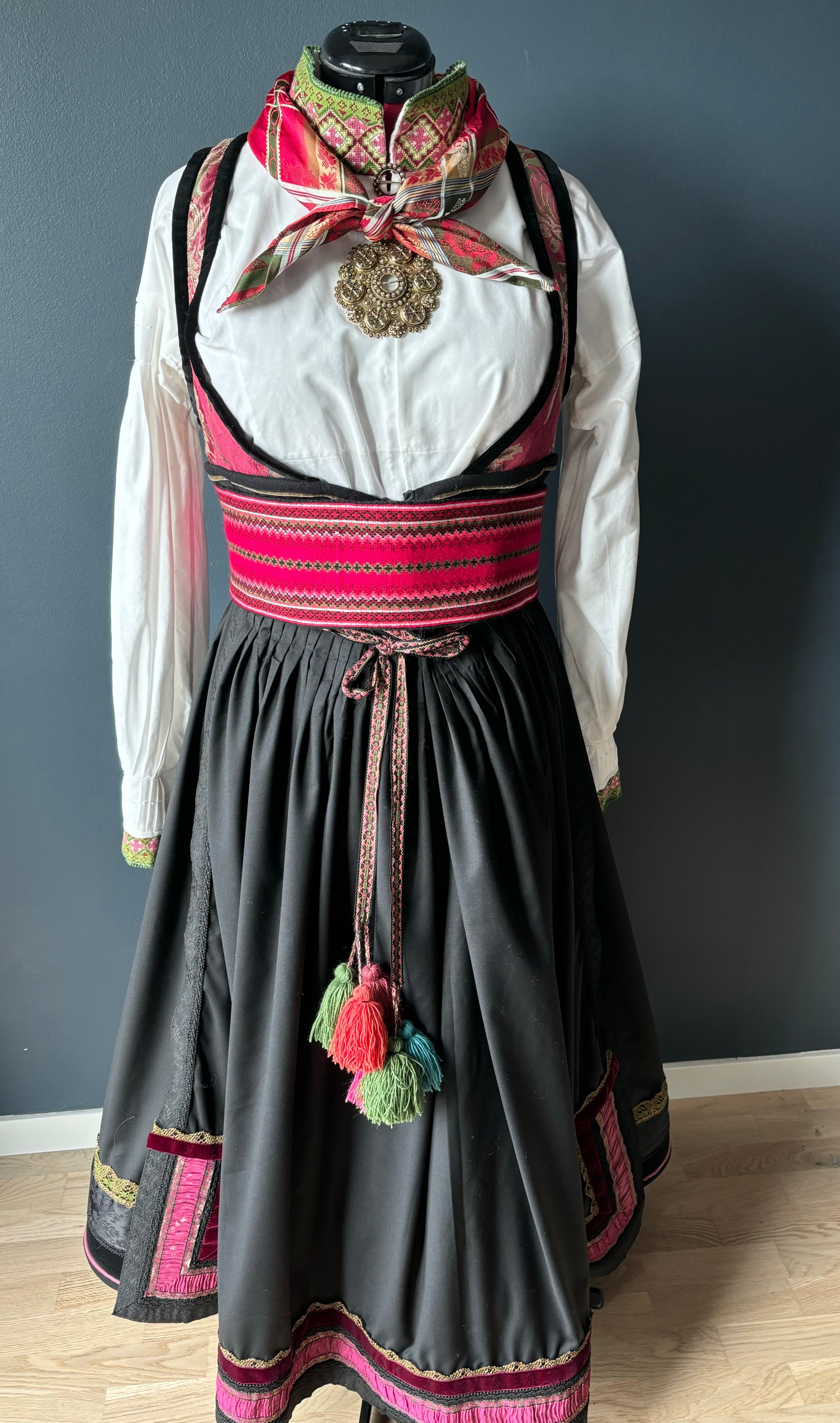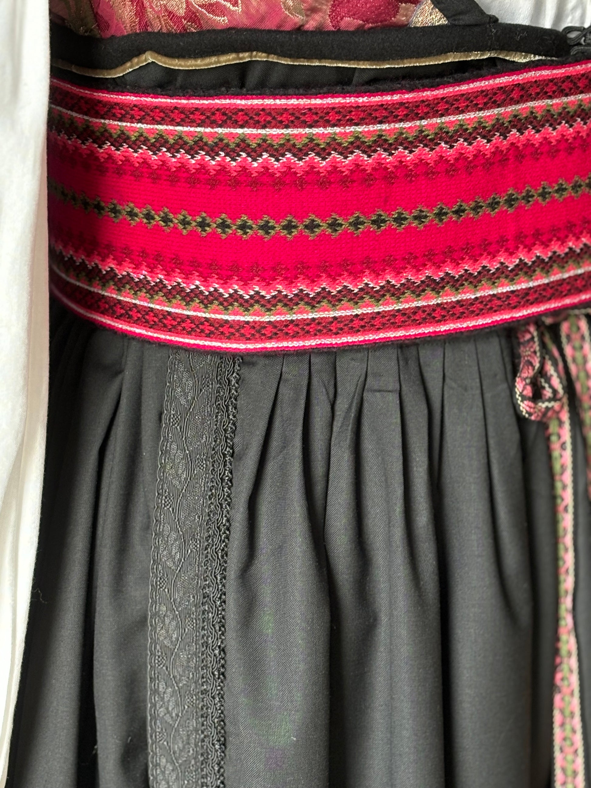 Her får du leid komplett beltestakk med brodert skjorte, søljer, mansjettknapper, silkeskjerf og vevd belte. Livet( vesten) er i 100% silke men svart fløyelskant. Forkle og kanten på stakken har fine bånd som harmonerer med resten av beltestakken.
