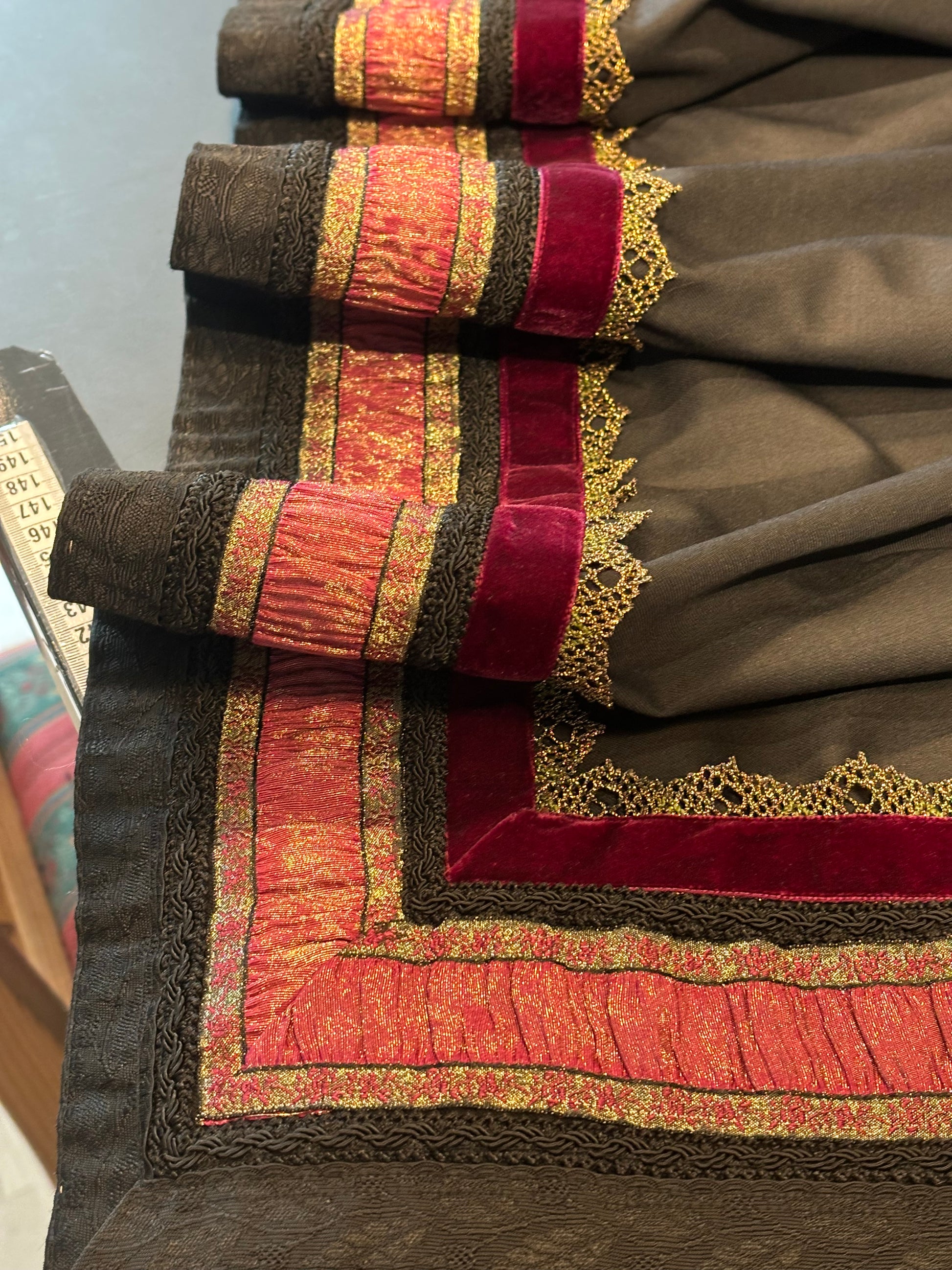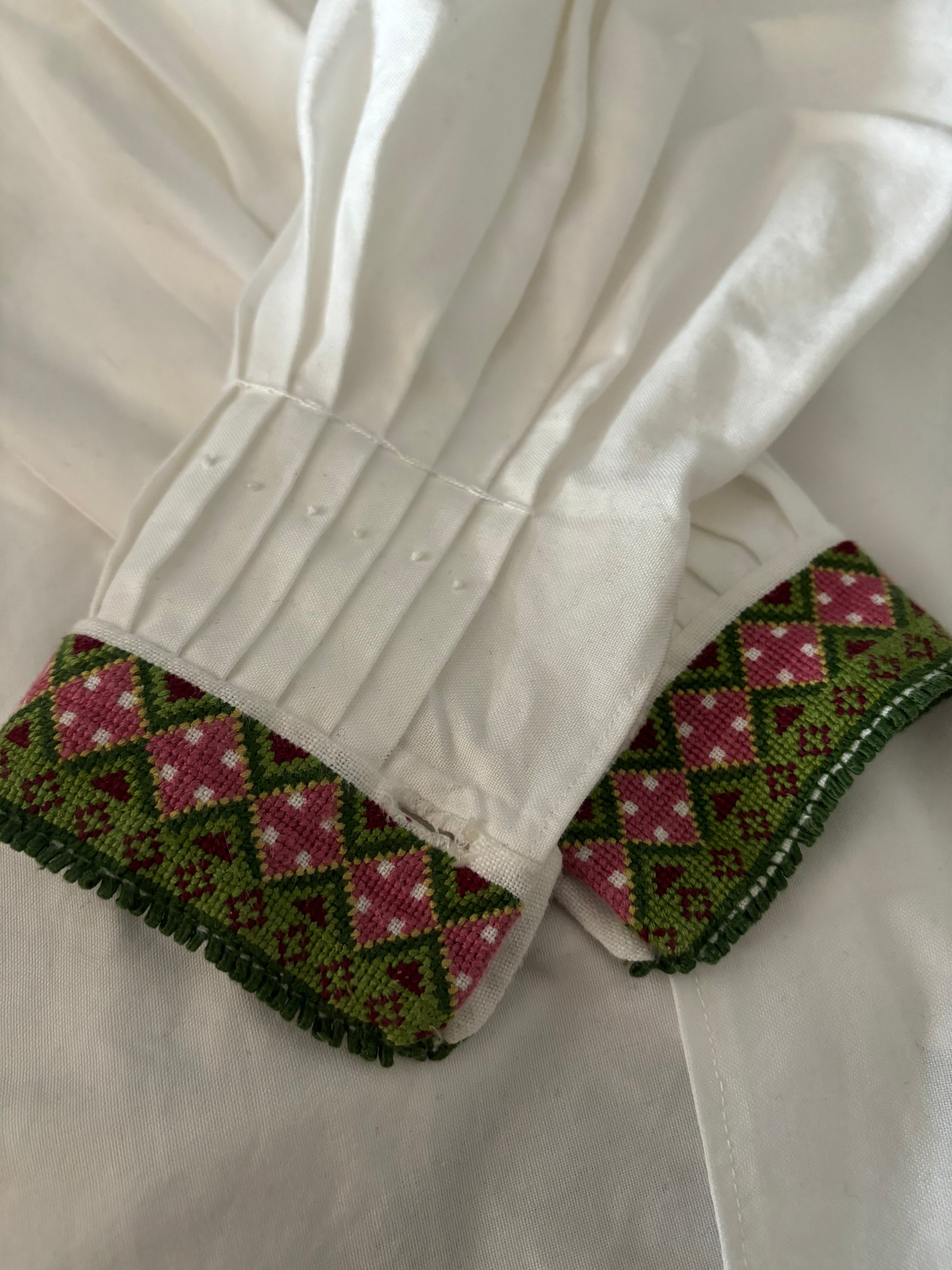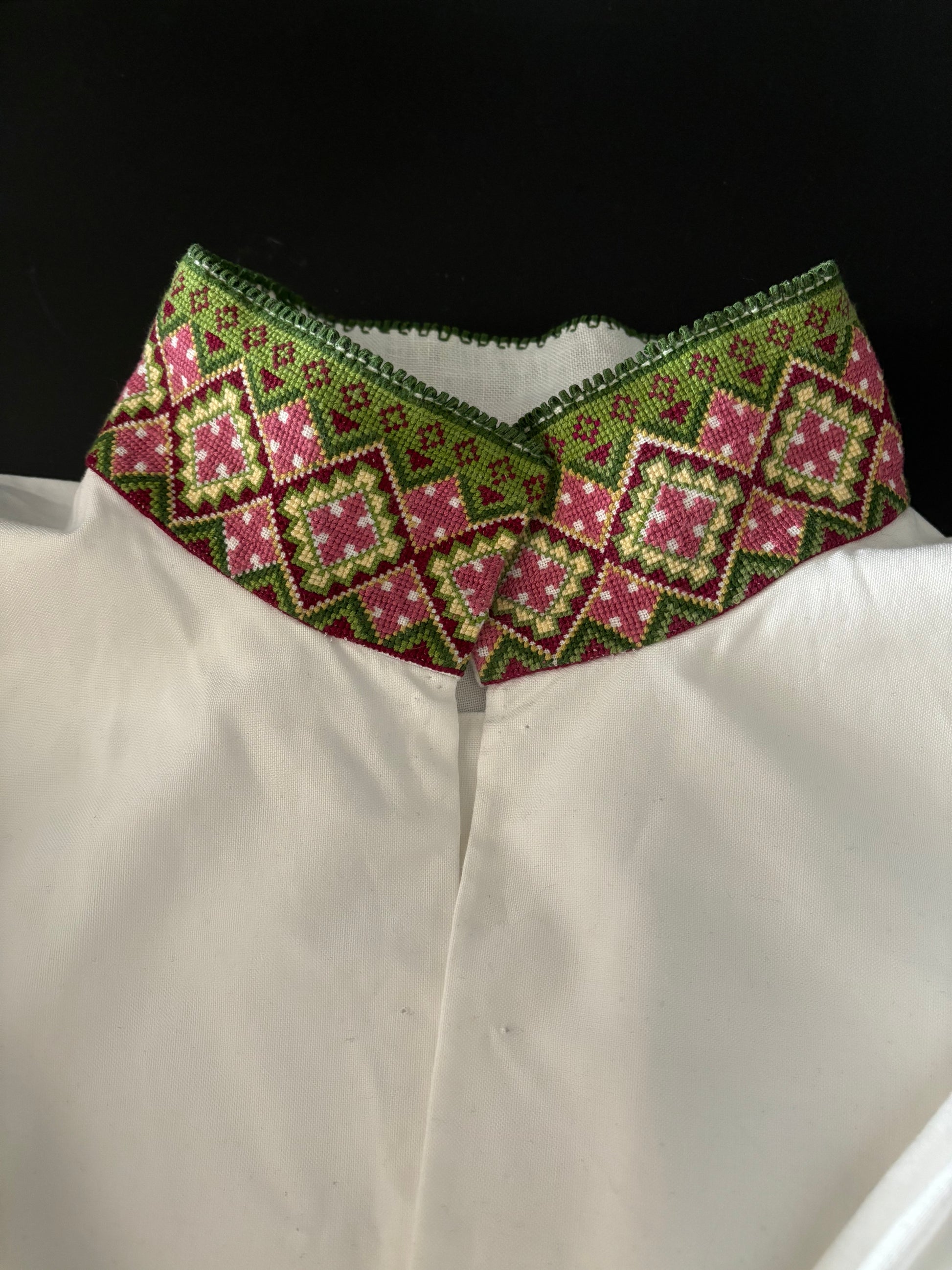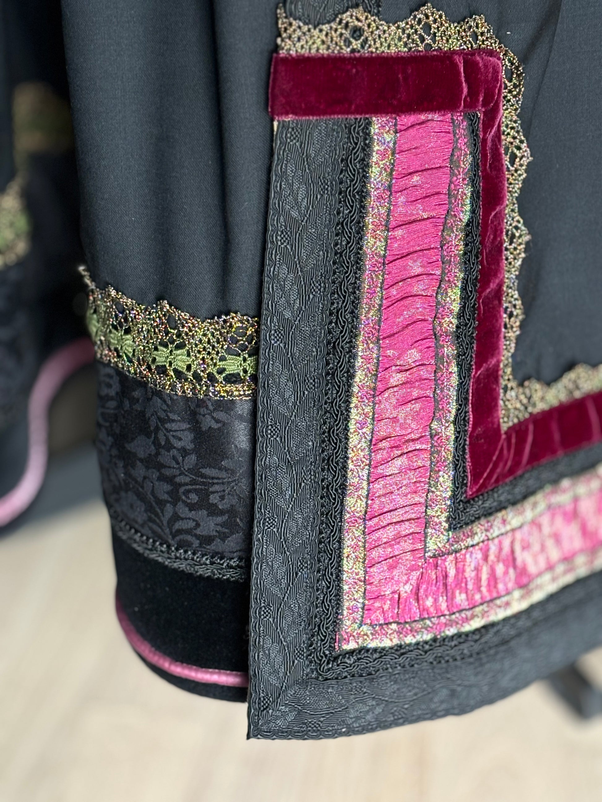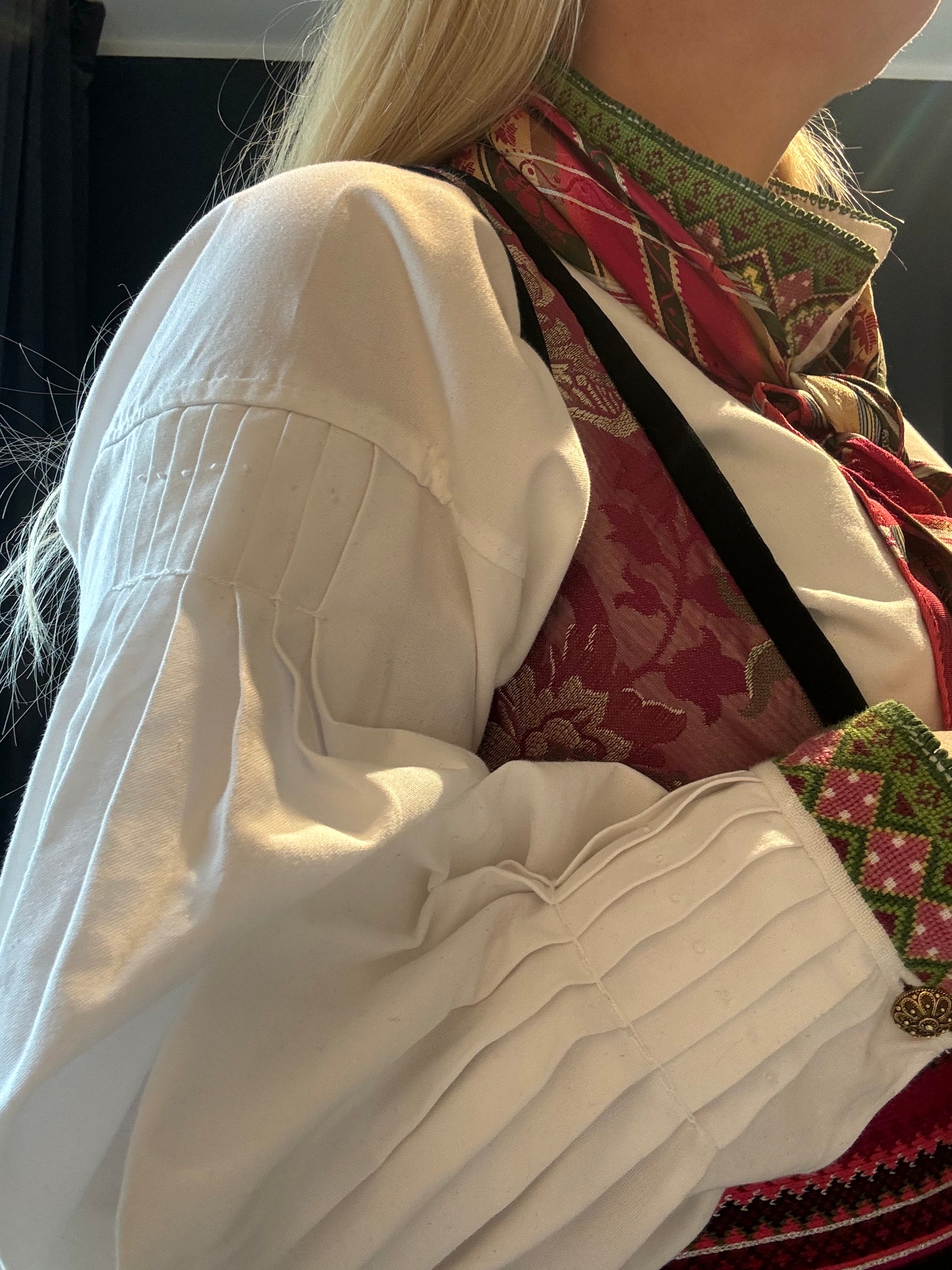 Her får du leid komplett beltestakk med brodert skjorte, søljer, mansjettknapper, silkeskjerf og vevd belte. Livet( vesten) er i 100% silke men svart fløyelskant. Forkle og kanten på stakken har fine bånd som harmonerer med resten av beltestakken.
